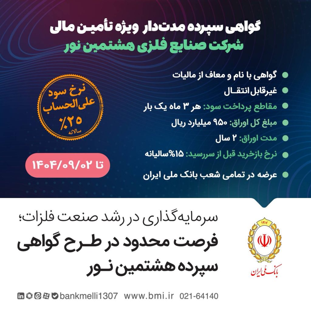 بانک ملی ایران در راستای حمایت از پروژه‌های صنعتی و توسعه زیرساخت‌های تولیدی کشور، گواهی سپرده مدت‌دار ویژه سرمایه‌گذاری (خاص) را به منظور تأمین مالی سرمایه ثابت شرکت صنایع فلزی هشتمین نور منتشر می‌کند.